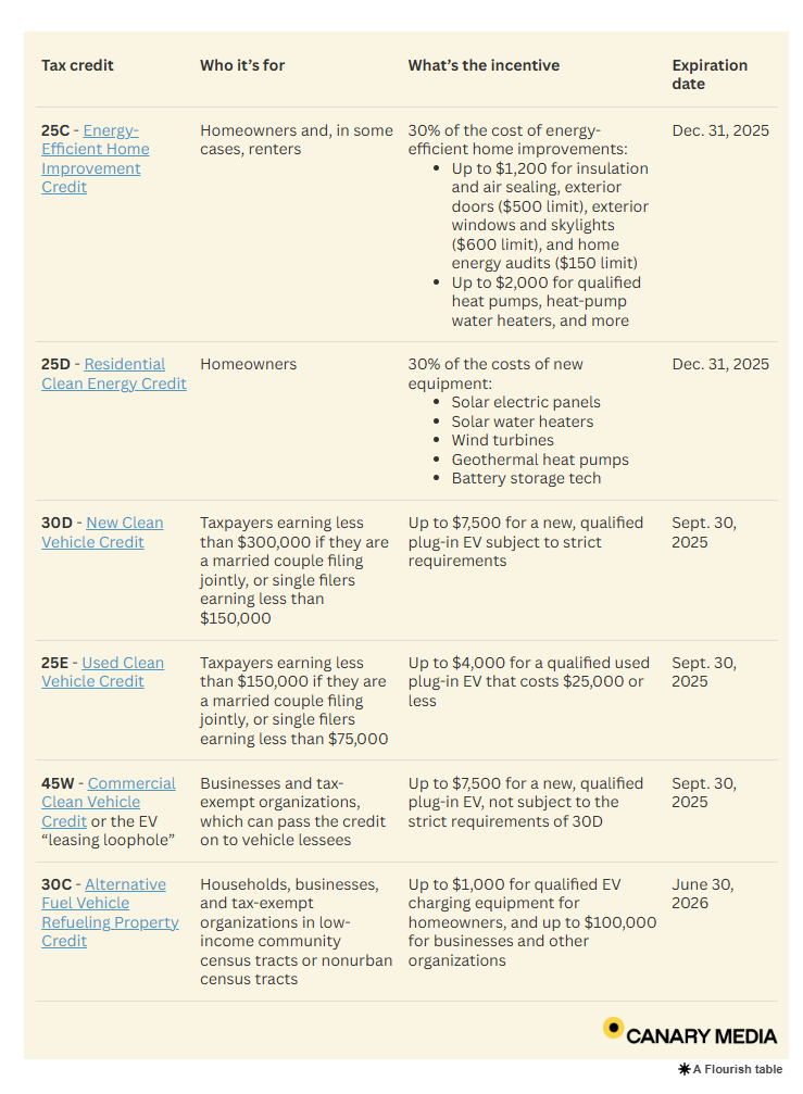 NOTE: Nearly all Federal Tax Credits for improving efficiency and electrification efforts will be ending by December 2025. Click on the image chart below for more details. Contractors, installers, and dealers should be aware of the details as well. Credits will require an additional form, or steps depending on how you file, to be submitted with your tax filing. For example, Form 5695 is completed for residential improvements to the building envelope (doors, windows) and heat pumps.